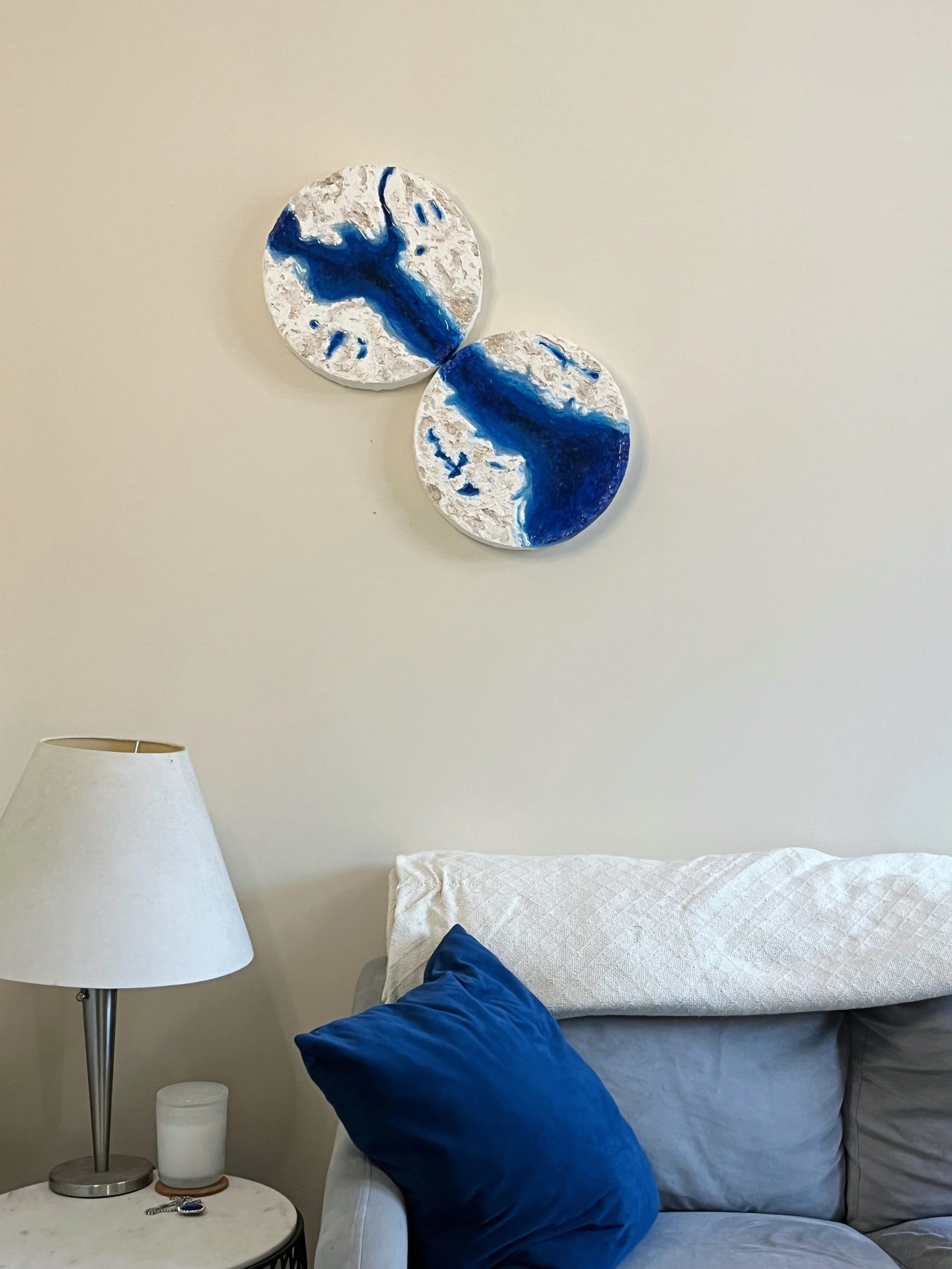 Blue Cascades is sculptural artwork in the Blue Fluidity series. This hand sculpted art piece is made from grout, joint compound, clay, paint and resin. Blue Cascades is a divided circular landscape of expansive blue water.